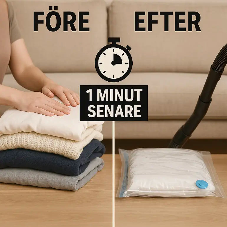 Med våra vakuumpåsar sparar du upp till 80 procent plats på bara några sekunder. Perfekt för kläder, täcken, kuddar och textilier som annars tar onödigt mycket plats i hemmet. En smart lösning som gör förvaringen enkel och organiserad.